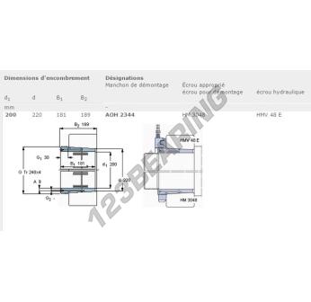 The Adapter Sleeve, known as AOH2344-SKF SKF, has an inner diameter of 200 mm, an outer diameter of 220 mm and a thickness of 181 mm.