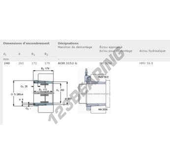 The Adapter Sleeve, known as AOH3152G-SKF SKF, has an inner diameter of 240 mm, an outer diameter of 260 mm and a thickness of 172 mm.