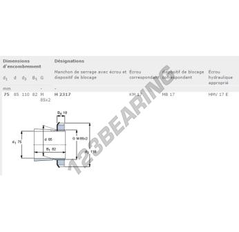 The Adapter Sleeve, known as H2317-SKF SKF, has an inner diameter of 75 mm, an outer diameter of 110 mm and a thickness of 82 mm.
