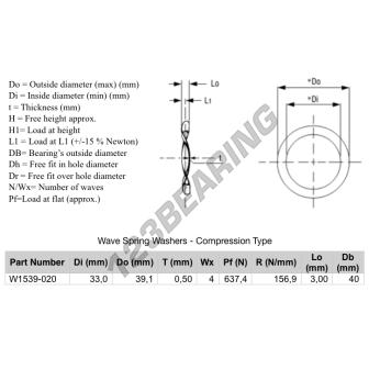 The Wave Spring Washers- Compression Type with the reference WSW-CT-39.100-33-0.500-4 has an inner diameter of 33 mm, an outer diameter of 39.1 mm and a thickness of 0.5 mm. It is made of STEEL.