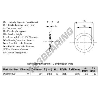 The Wave Spring Washers- Compression Type with the reference WSW-CT-79-71-0.500-5 has an inner diameter of 71 mm, an outer diameter of 79 mm and a thickness of 0.5 mm. It is made of STEEL.