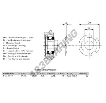 The Finger Spring Washer with the reference FSW3-31.500-17.480-0.254 has an inner diameter of 17.48 mm, an outer diameter of 31.5 mm and a thickness of 0.254 mm.