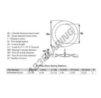 The Overlap Wave Spring Washer with the reference WWO008701016 has an inner diameter of 15.75 mm and a thickness of 0.3 mm. It is made of STEEL.
