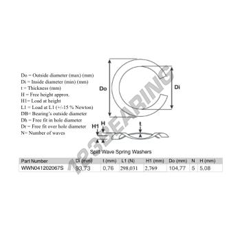 The Split Wave Spring Washer with the reference SWSW-104.770-93.730-0.760-5-SS has an inner diameter of 93.73 mm and a thickness of 0.76 mm. It is made of STAINLESS STEEL.