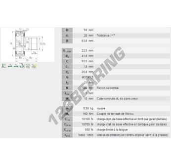 The Cam Follower, known as KR5204-2RS-INA INA, has an inner diameter of 20 mm, an outer diameter of 52 mm and a thickness of 63.6 mm.