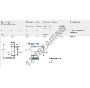 The Deep Groove Ball Bearing, known as 16040-SKF SKF, has an inner diameter of 200 mm, an outer diameter of 310 mm and a thickness of 34 mm.