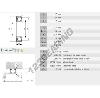 The Deep Groove Ball Bearing, known as 61903-ZZ-INA from the brand INA, has an inner diameter of 17 mm, an outer diameter of 30 mm and a thickness of 7 mm.