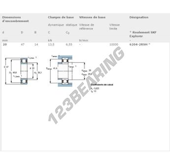 The Deep Groove Ball Bearing, known as 6204-2RS-SKF SKF, has an inner diameter of 20 mm, an outer diameter of 47 mm and a thickness of 14 mm.