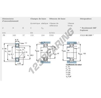 The Deep Groove Ball Bearing, known as 7315-BECBM-SKF from the brand SKF, has an inner diameter of 75 mm, an outer diameter of 160 mm and a thickness of 37 mm.