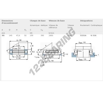 The Thrust Ball Bearing, known as 53316-SKF SKF, has an inner diameter of 80 mm, an outer diameter of 140 mm and a thickness of 52 mm.