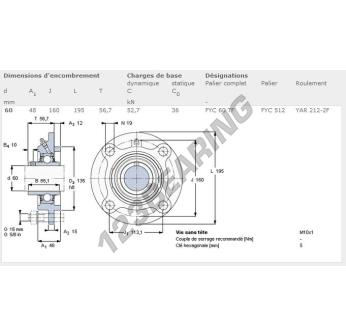 The Housed Bearing - 4 Bolts known as FYC60-TF-SKF SKF has a shaft diameter of 60 mm and a fixing spacing of 113.1 mm. This part number is produced in cast iron and the tightening type is .