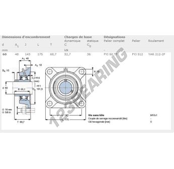 The Housed Bearing - 4 Bolts known as FYJ60-TF-SKF SKF has a shaft diameter of 60 mm and a fixing spacing of 143 mm. This part number is produced in cast iron and the tightening type is .