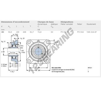 The Housed Bearing - 4 Bolts known as FYJ80-TF-SKF SKF has a shaft diameter of 80 mm and a fixing spacing of 165 mm. This part number is produced in cast iron and the tightening type is .