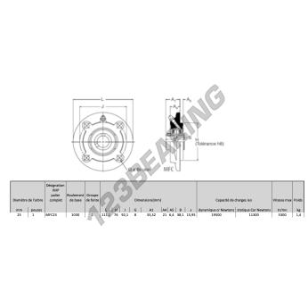 The Housed Bearing - 4 Bolts known as MFC25-RHP RHP has a shaft diameter of 25 mm and a fixing spacing of 92.1 mm. This part number is produced in cast iron and the tightening type is .