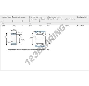 The Needle Roller Bearing, known as NA4826-SKF SKF, has an inner diameter of 130 mm, an outer diameter of 165 mm and a thickness of 35 mm.