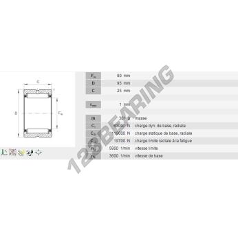 The Needle Roller Bearing, known as NK80-25-INA INA, has an inner diameter of 80 mm, an outer diameter of 95 mm and a thickness of 25 mm.