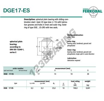 The Rod End Ge known as DGE17-ES-DURBAL DURBAL has an inside diameter of 17 mm, an outside diameter of 30 mm and a thickness of 10 mm.