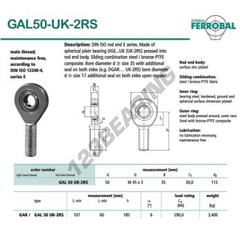 The Rod End Ge known as GAL50-UK-2RS-DURBAL DURBAL has an inside diameter of 50 mm, an outside diameter of 112 mm and a thickness of 35 mm.