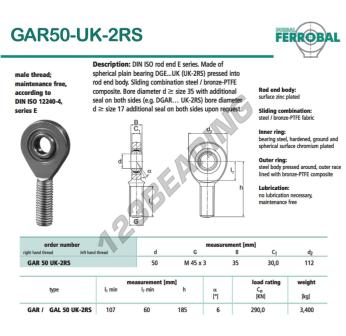 The Rod End Ge known as GAR50-UK-2RS-DURBAL DURBAL has an inside diameter of 50 mm, an outside diameter of 112 mm and a thickness of 35 mm.