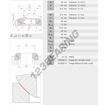 The Rod End Ge known as GE50AW-INA INA has an inside diameter of 50 mm, an outside diameter of 130 mm and a thickness of 42.5 mm.