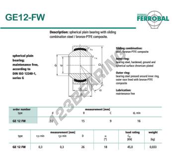 The Rod End Geew known as GE12-FW-DURBAL DURBAL has an inside diameter of 12 mm, an outside diameter of 26 mm and a thickness of 9 mm.