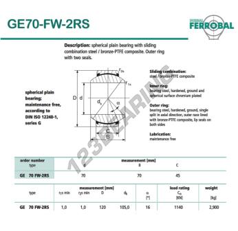 The Rod End Geew known as GE70-FW-2RS-DURBAL DURBAL has an inside diameter of 70 mm, an outside diameter of 120 mm and a thickness of 45 mm.
