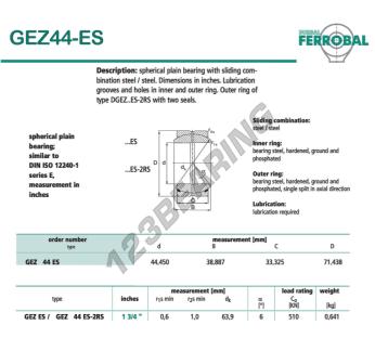 The Rod End Geew known as GEZ44-ES-DURBAL DURBAL has an inside diameter of 44.45 mm, an outside diameter of 71.438 mm and a thickness of 33.325 mm.