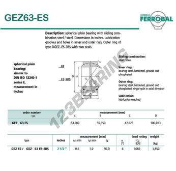 The Rod End Geew known as GEZ63-ES-DURBAL DURBAL has an inside diameter of 63.5 mm, an outside diameter of 100.013 mm and a thickness of 47.625 mm.