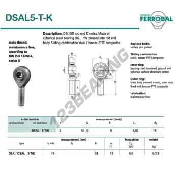 The Rod End Sa known as DSAL5-T-K-DURBAL DURBAL has a screw thread of , an inner diameter of 5 mm, an outer diameter of 18 mm and a thickness of 8 mm.