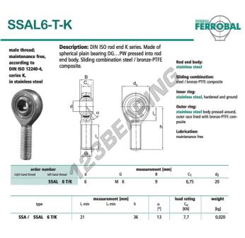 The Rod End Sa known as DSSAL6-T-K-DURBAL DURBAL has a screw thread of , an inner diameter of 6 mm, an outer diameter of 20 mm and a thickness of 9 mm.