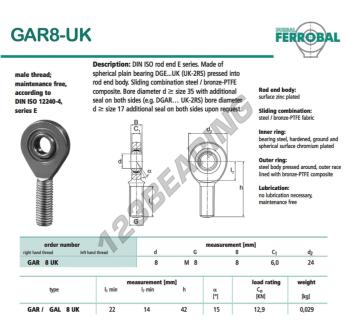 The Rod End Sa known as GAR8-UK-DURBAL DURBAL has a screw thread of , an inner diameter of 8 mm, an outer diameter of 24 mm and a thickness of 8 mm.