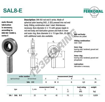 The Rod End Sa known as SAL8-E-DURBAL DURBAL has a screw thread of , an inner diameter of 8 mm, an outer diameter of 24 mm and a thickness of 8 mm.