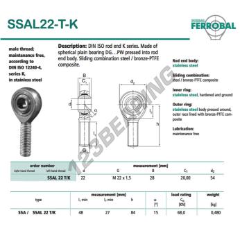The Rod End Sa known as SSAL22-T-K-DURBAL DURBAL has a screw thread of , an inner diameter of 22 mm, an outer diameter of 54 mm and a thickness of 28 mm.