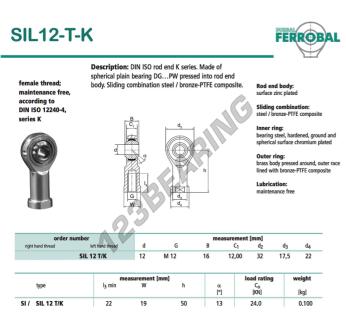 The Rod End Si known as SIL12-T-K-DURBAL DURBAL has an inside diameter of 12 mm, an outside diameter of 32 mm and a thickness of 16 mm.