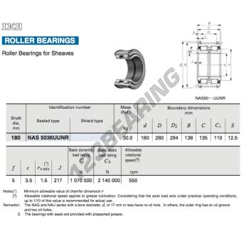 The Roller Bearing, known as NAS5036-UU-NR-IKO IKO, has an inner diameter of 180 mm, an outer diameter of 280 mm and a thickness of 136 mm.