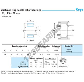 The Roller Bearing, known as NQI203220AD-NTN NTN, has an inner diameter of 20 mm, an outer diameter of 32 mm and a thickness of 20 mm.