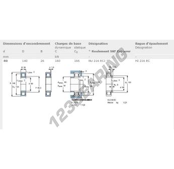 The Roller Bearing, known as NU216-ECJ-SKF SKF, has an inner diameter of 80 mm, an outer diameter of 140 mm and a thickness of 26 mm.