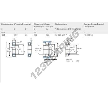 The Roller Bearing, known as NU221-ECP-SKF SKF, has an inner diameter of 105 mm, an outer diameter of 190 mm and a thickness of 36 mm.