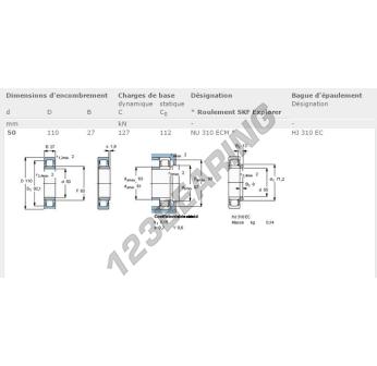 The Roller Bearing, known as NU310-ECM-SKF SKF, has an inner diameter of 50 mm, an outer diameter of 110 mm and a thickness of 27 mm.