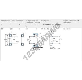 The Roller Bearing, known as NU311-ECJ-SKF SKF, has an inner diameter of 55 mm, an outer diameter of 120 mm and a thickness of 29 mm.
