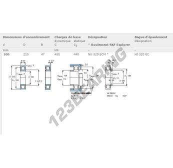 The Roller Bearing, known as NU320-ECM-SKF SKF, has an inner diameter of 100 mm, an outer diameter of 215 mm and a thickness of 47 mm.