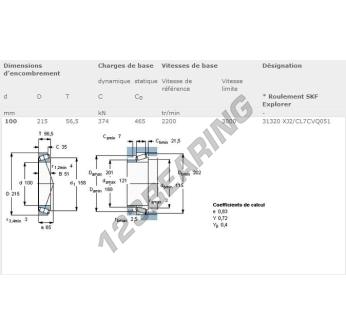 The Tapered Roller Bearing, known as 31320XJ2-QCL7CVQ051-SKF SKF, has an inner diameter of 100 mm, an outer diameter of 215 mm and a thickness of 56.5 mm.