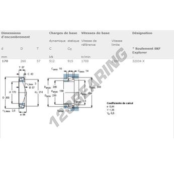 The Tapered Roller Bearing, known as 32034X-SKF SKF, has an inner diameter of 170 mm, an outer diameter of 260 mm and a thickness of 57 mm.
