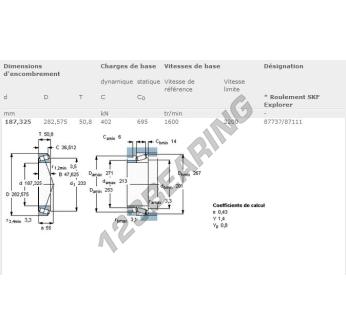 The Tapered Roller Bearing, known as 87737-87111-SKF SKF, has an inner diameter of 187.33 mm, an outer diameter of 282.58 mm and a thickness of 50.8 mm.