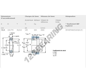 The Tapered Roller Bearing, known as HM807046-HM804010-QCL7C-SKF SKF, has an inner diameter of 50.8 mm, an outer diameter of 104.78 mm and a thickness of 36.51 mm.