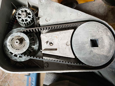 Here we see the two new belts 450-5M15-OPTIBELT and 270-5M15-OPTIBELT on this Al-ko 38 scarifier.