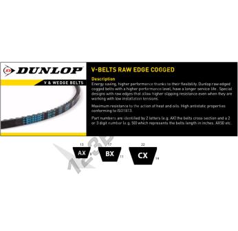 The AX41-DUNLOP belt of the Raw Edge Cogged V-belt family, by brand DUNLOP, and in AX profile. It has a 13mm x 8mm section with a 1041 mm internal length, a 1091 mm external length, and a 1071 mm primitive length.