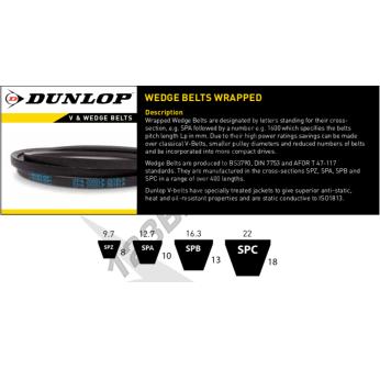 The SPC7100-DUNLOP belt of the V-belt Wrapped family, by brand DUNLOP, and in SPC profile. It has a 22mm x 18mm section with a 7017 mm internal length, a 7130 mm external length, and a mm primitive length.